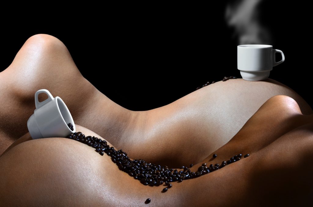 A photograph of two white cups of hot coffee with lots of coffee beans, which lie on two beautiful and sexy naked female bodies. Erotic photo about the use of coffee drinks